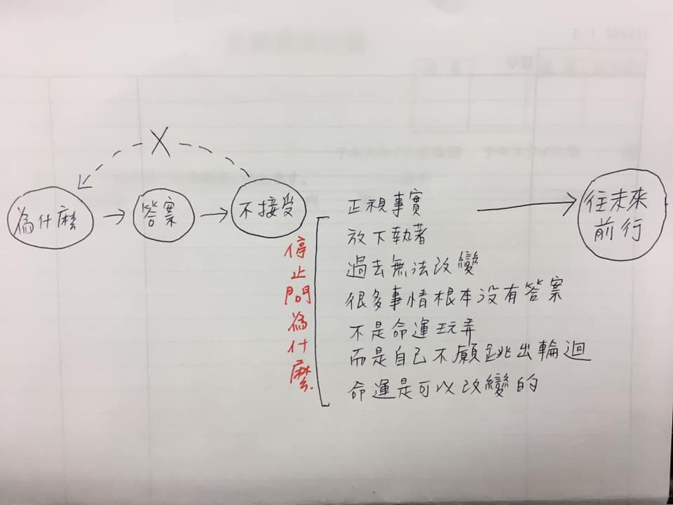 必須明白傷害你的過去已經過去了,是自己一直用「為什麼」把這個過去抓回來折磨自己。一直用為什麼來讓自己停在過去,就可以不用面對無能為力的現在。